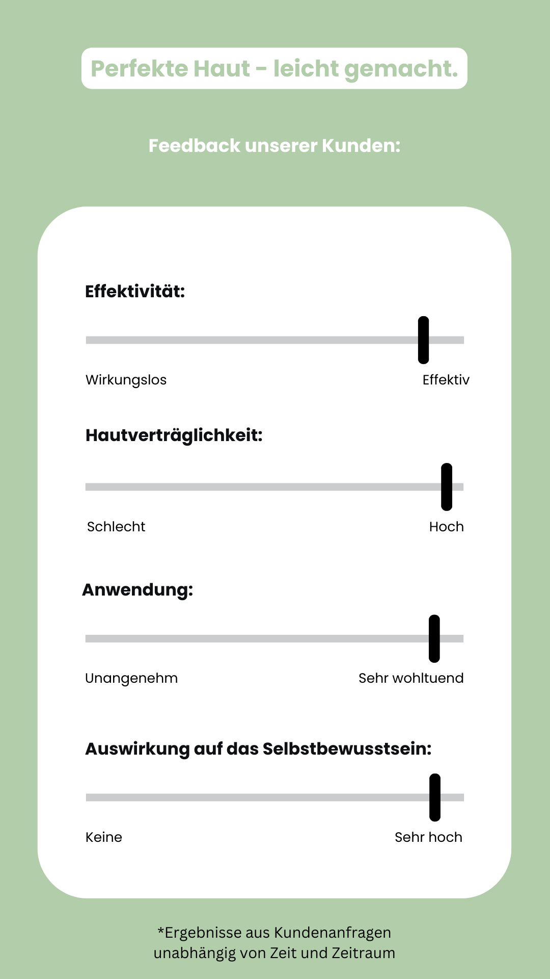 Die Ergebnisse können je nach Hauttyp und individuellen Bedürfnissen variieren. Ein Großteil unserer Kundinnen berichten jedoch bereits nach regelmäßiger Anwendung innerhalb von ein bis zwei Wochen von sichtbaren Verbesserungen. Um optimale Ergebnisse zu erzielen, empfehlen wir eine kontinuierliche Anwendung gemäß den Anweisungen.